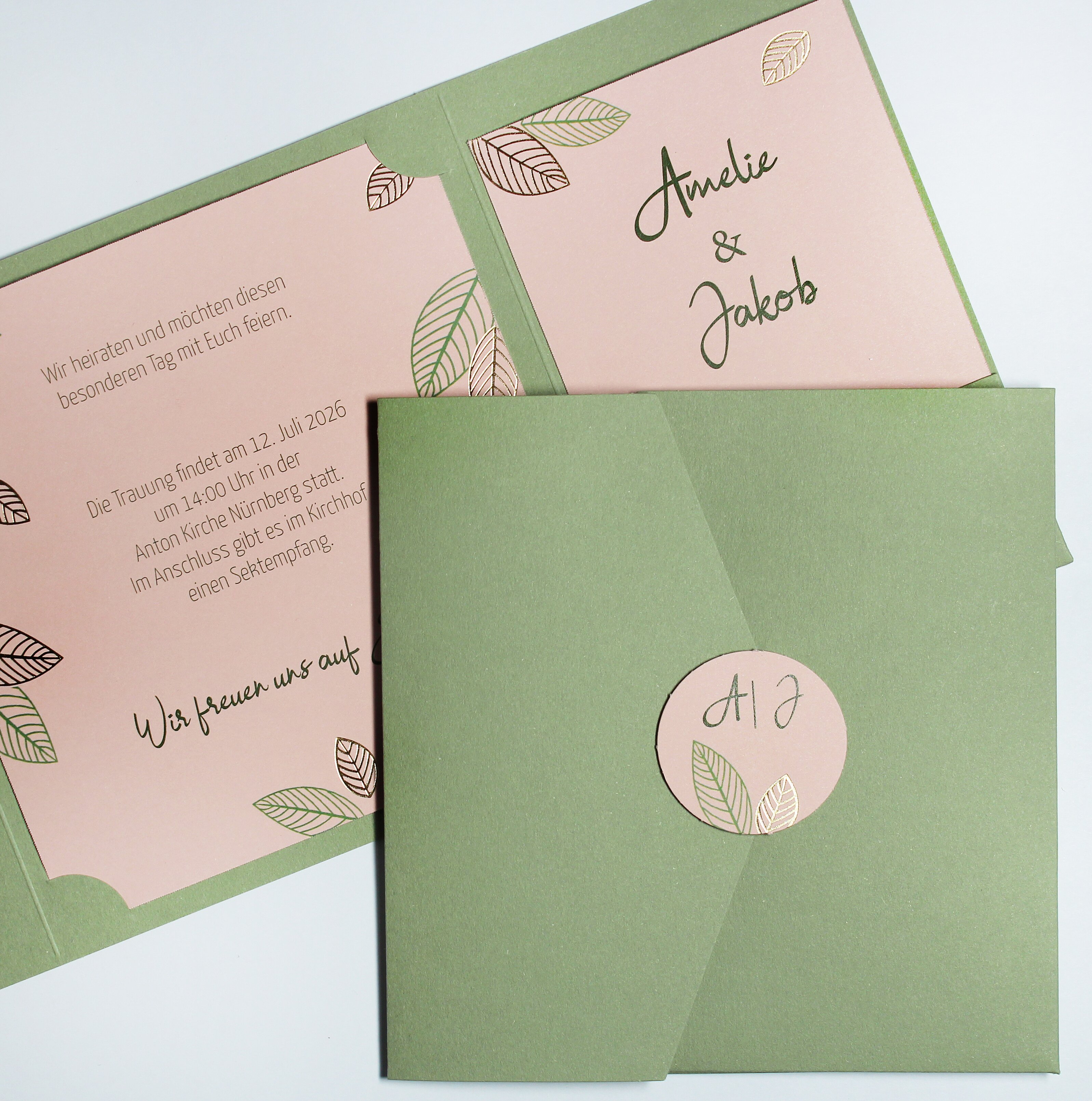 Die edle Pocketfold-Hochzeitskarte in lindgrün aus hochwertigem Design-Karton mit verschiedenen Einsteckkarten und Verschlusssiegel.