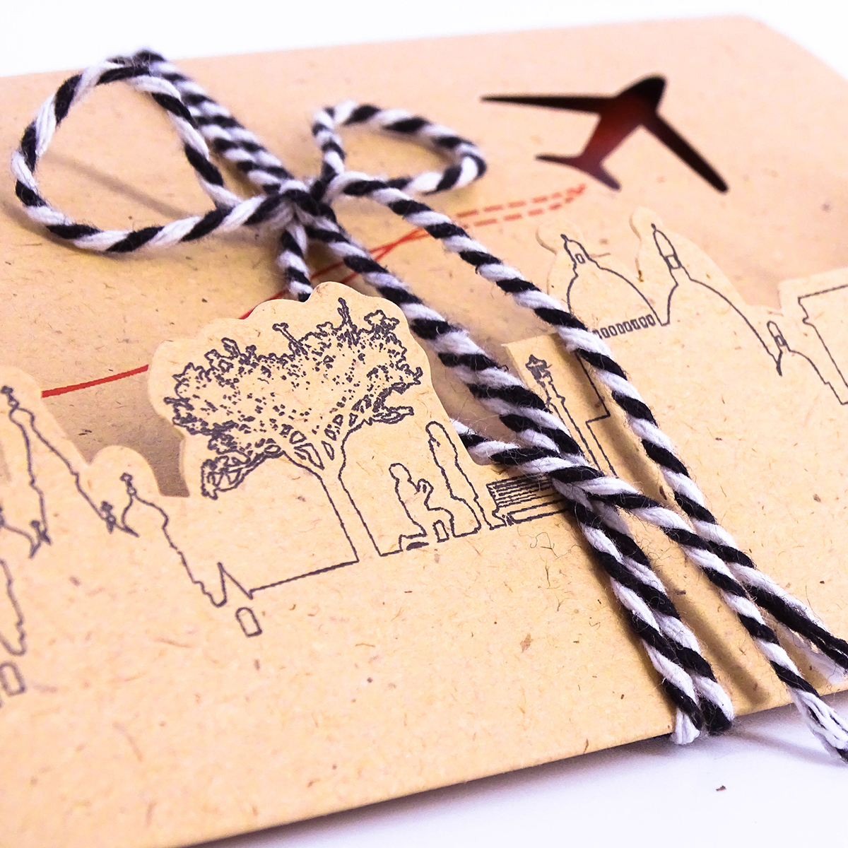 Die Einstecktasche ist aus braunem Kraftkarton mit ausgestanzten Flugzeug und einer romantischen Skyline.