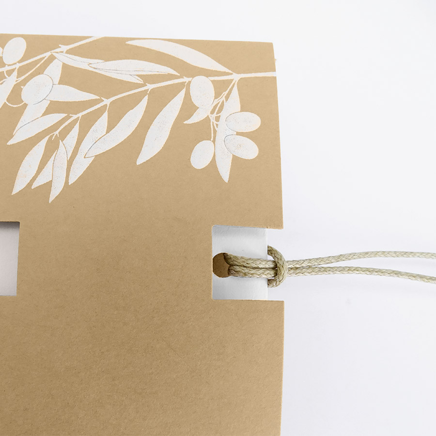 Die Einstecktasche ist aus hochwertigem, braunem Design-Karton mit Fensterstanzung und mit weißer Prägung: Olivenzweige.
