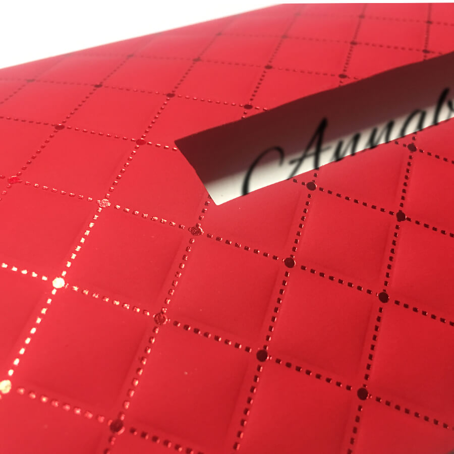 Die Einstecktasche ist aus hochwertigem, rotem Design-Karton mit Fensterstanzung und rot veredelter Wabenprägung.