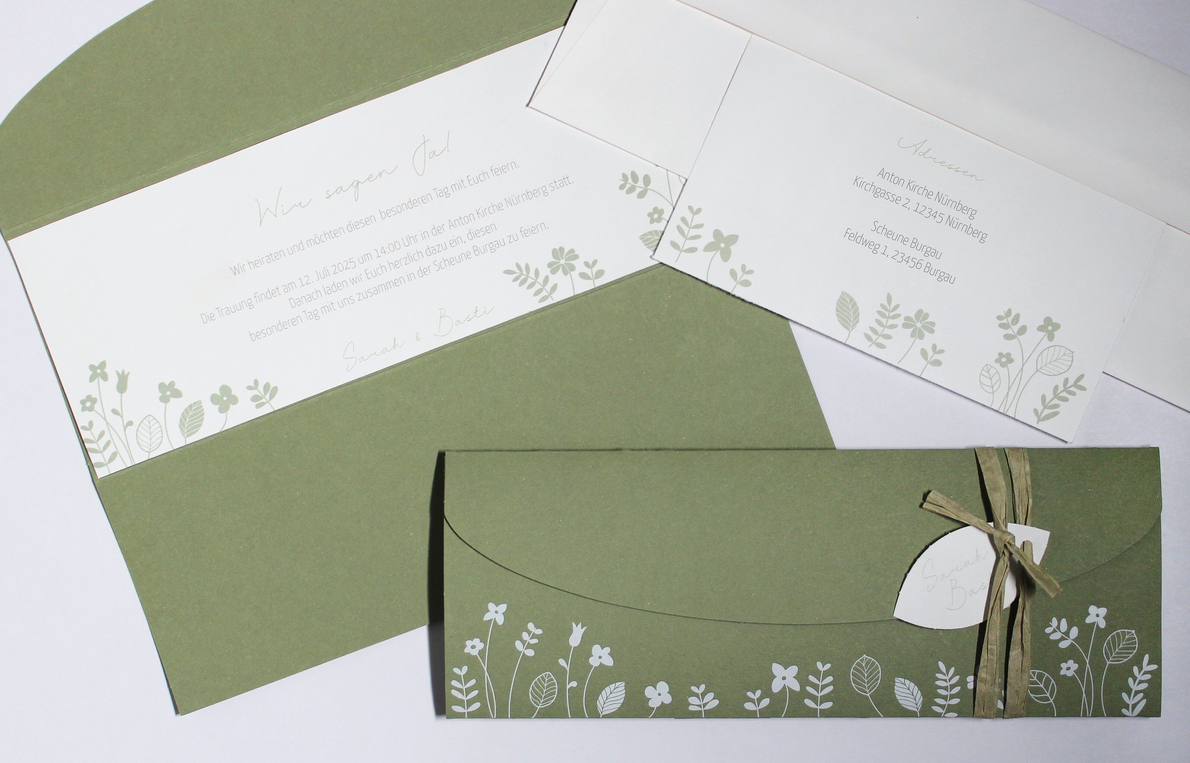 Die trendige Pocket-Hochzeitskarte in lichtgrün aus hochwertigem Design-Karton mit floralen zarten Elementen.