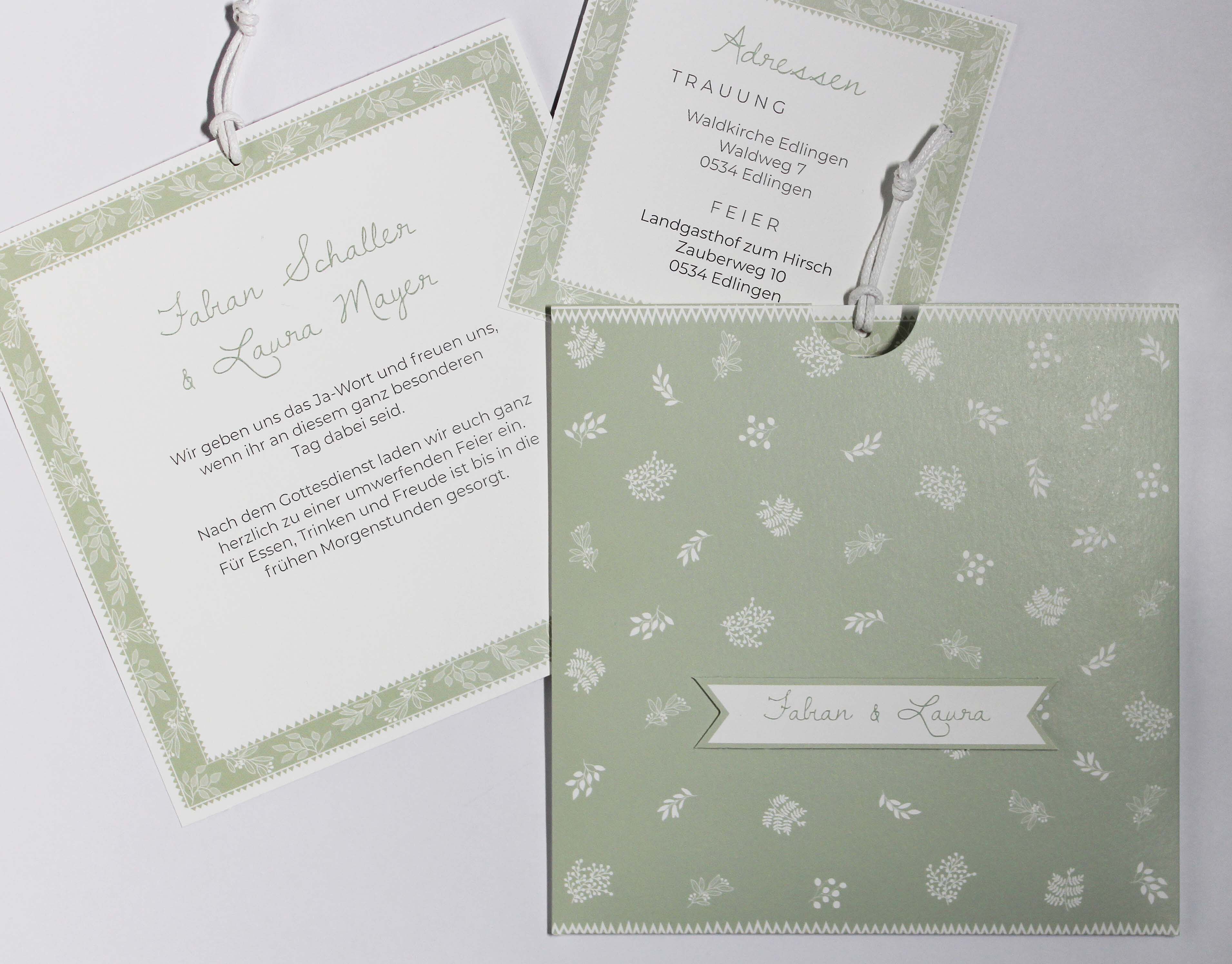 Die Einsteckkarten aus leicht strukturiertem Design-Karton sind umsäumt von einem lichtgrünen Rahmen mit zarten Zweigen