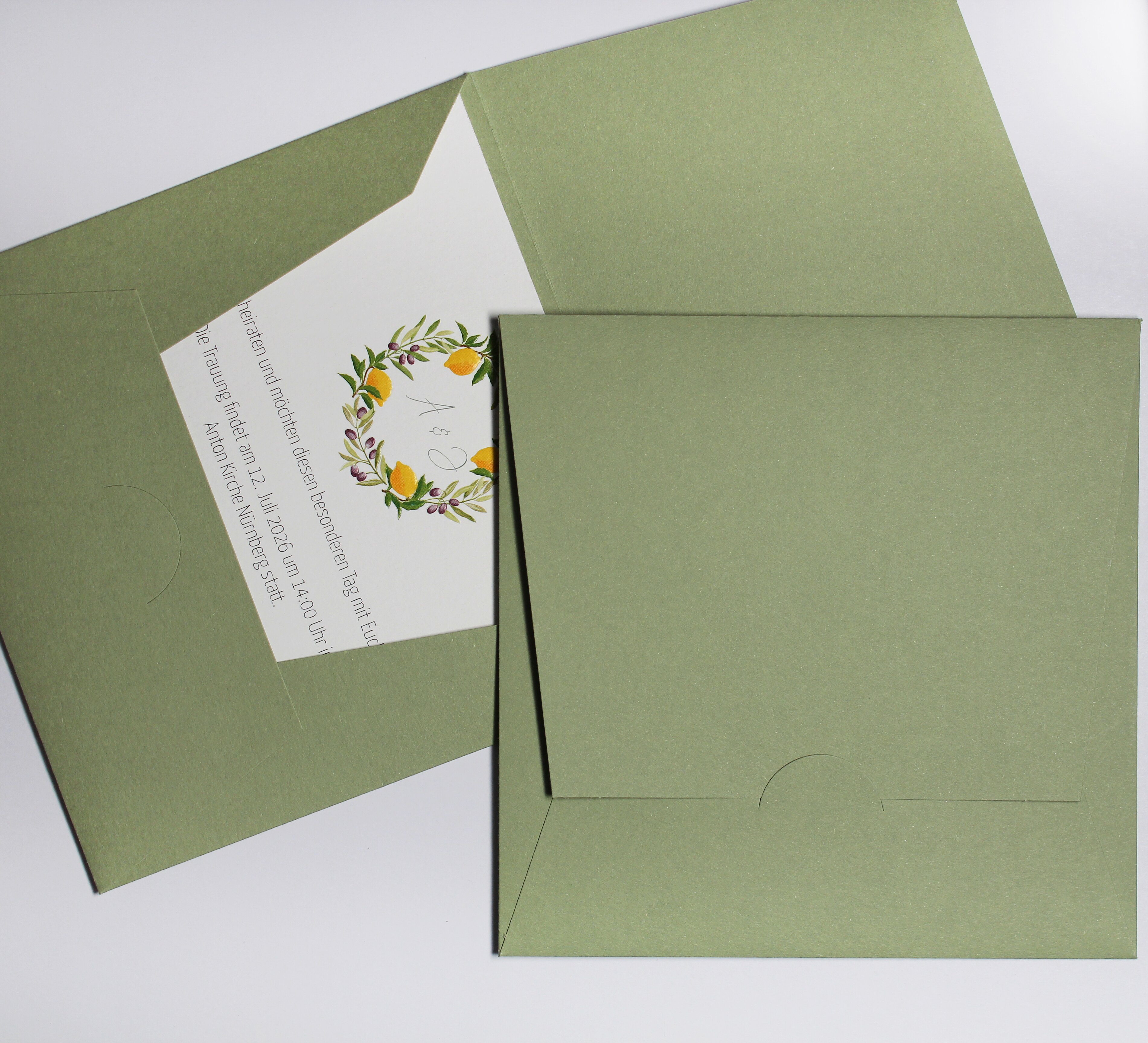 Das geprägte Arrangement mit Zitronen und Olivenzweigen auf den Einsteckkarten verleiht der Hochzeitskarte einen romantischen Charm.