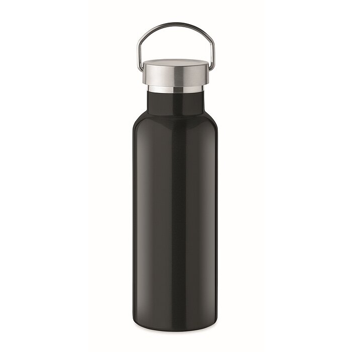 Nachhaltiger Trinkspass mit doppelwandiger Isolierflasche in der Farbe schwarz aus recyceltem Edelstahl (90 % recycelter Edelstahl und 10 % Edelstahl). Dank ihres Materials bietet die Trinkflasche nicht nur eine nachhaltige Alternative zu Einwegflaschen, sondern reduziert zudem den Bedarf an neuen Rohstoffen. Die spülmaschinenfeste Flasche bietet ein Fassungsvermögen von 500 ml und überzeugt nicht zuletzt mit ihrem stabilen Schraubverschluss mit Henkel. Durch ihre kompakte Größe und das leichte Gewicht ist sie zudem einfach zu tragen und eignet sich ideal als Begleiter für unterwegs - ganz egal ob bei der Arbeit oder in der Freizeit beim Sport.