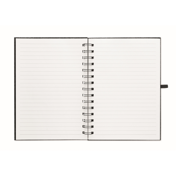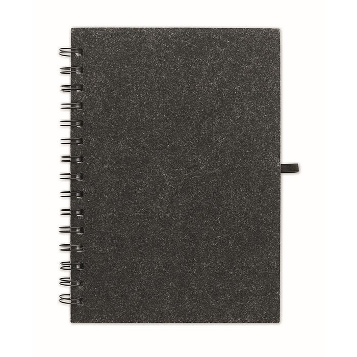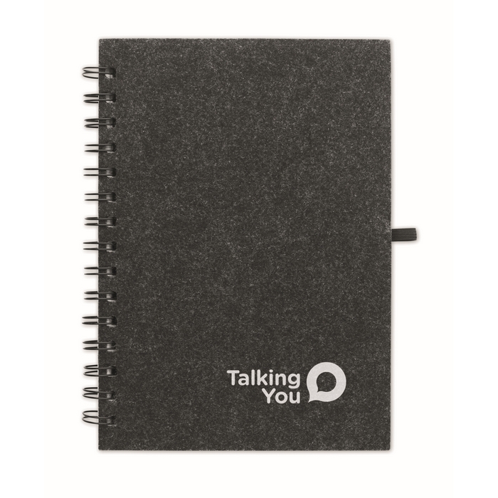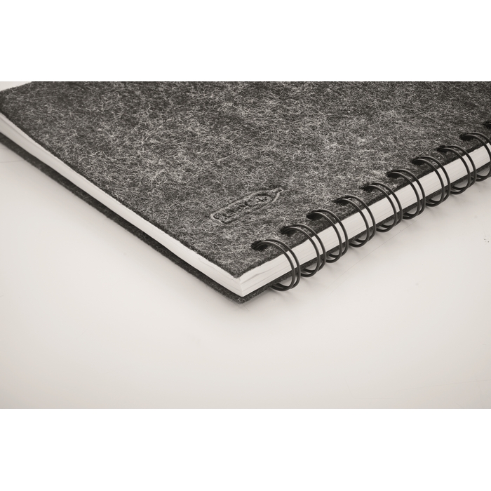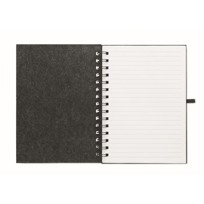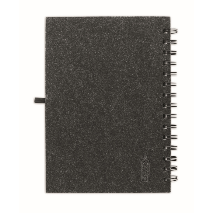DIN A5 Notizbuch mit RPET-Filz Cover dunkelgrau mit Spiralbindung 80 Blatt (160 Seiten) liniertes Recyclingpapier (70 g/m²). Elastische Stiftschlaufe.